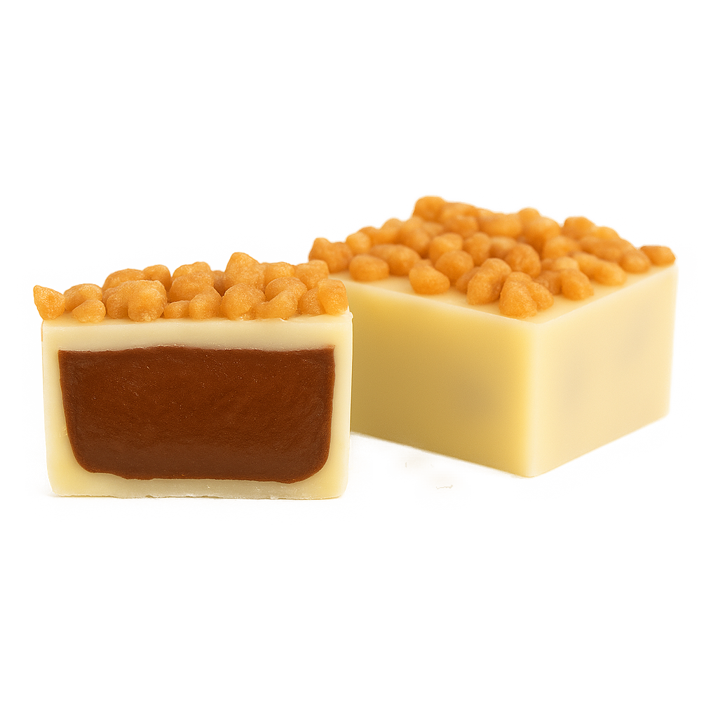 Gianduja paste covered with white chocolate, decorated with almond croquette.