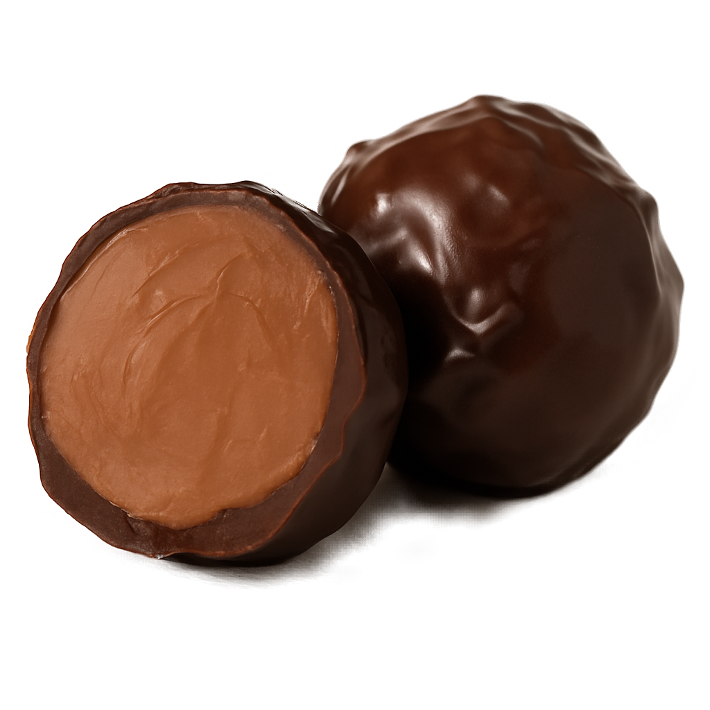 Hazlnut praline enrobed in dark chocolate.