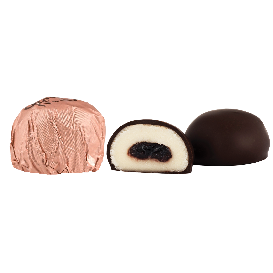 Αμυγδαλόπαστα με γέμιση αμαρένας, με επικάλυψη σοκολάτας dark.