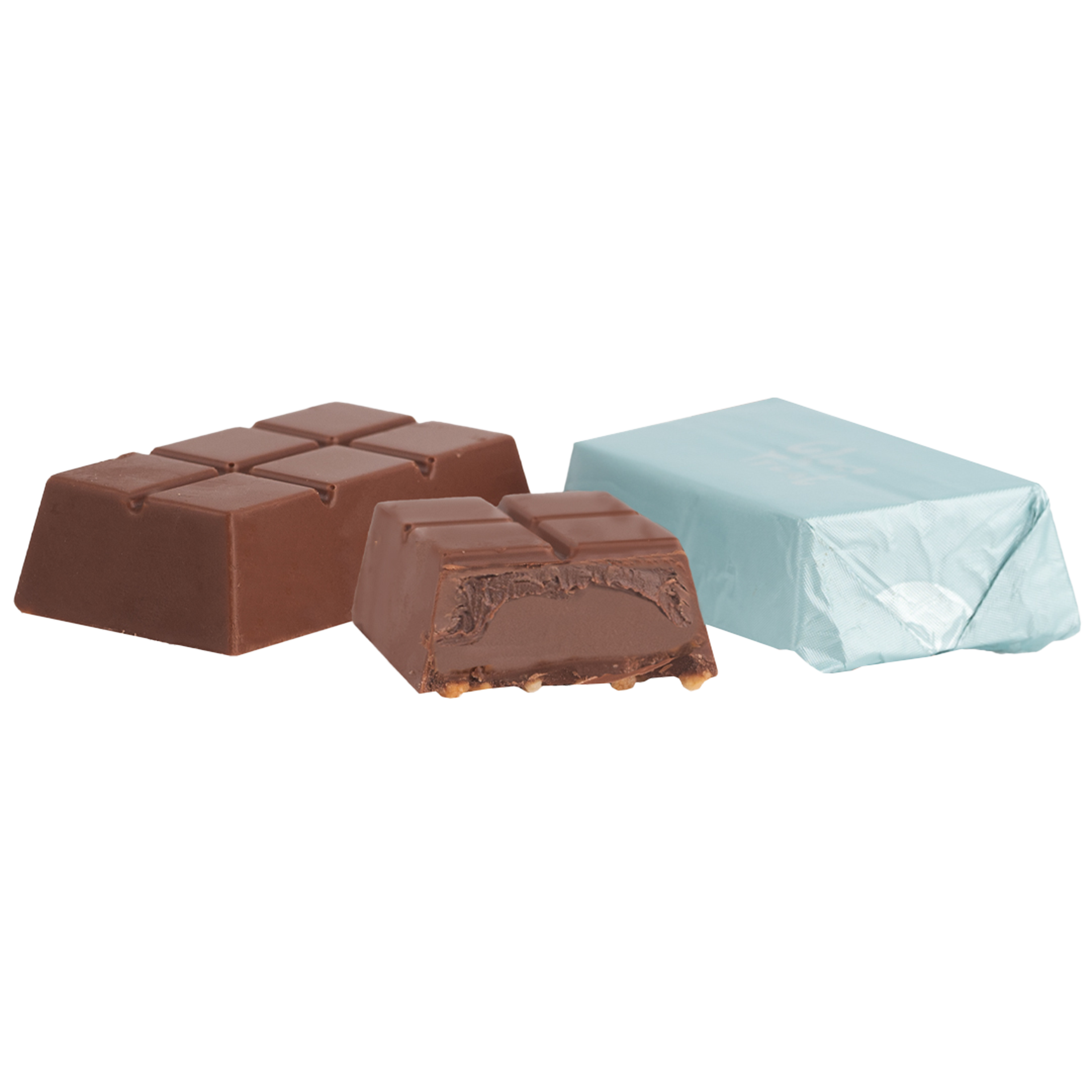 Πραλίνα φουντουκιού με καραμελωμένα κομμάτια αμυγδάλου σε σοκολάτα γάλακτος.