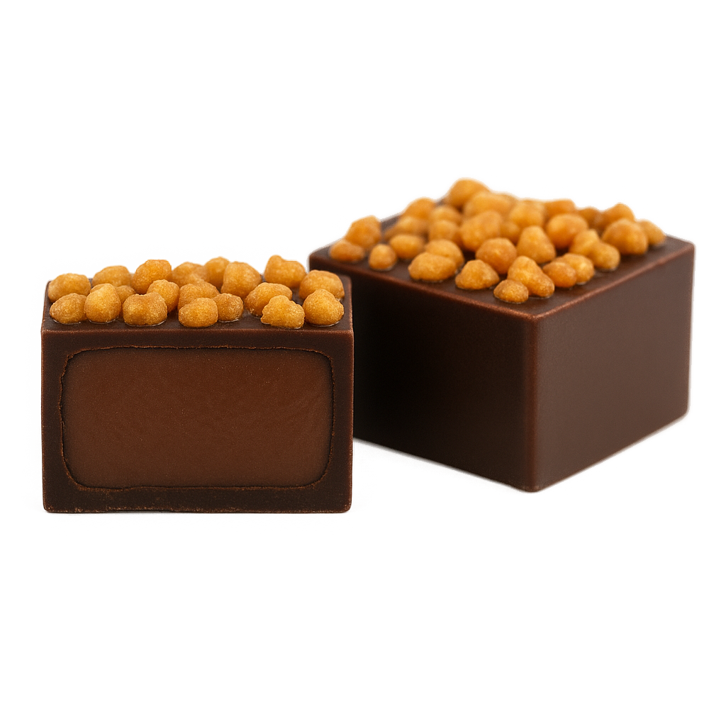 Πάστα Gianduja σε σοκολάτα dark, με διακόσμηση κροκάν αμυγδάλου.